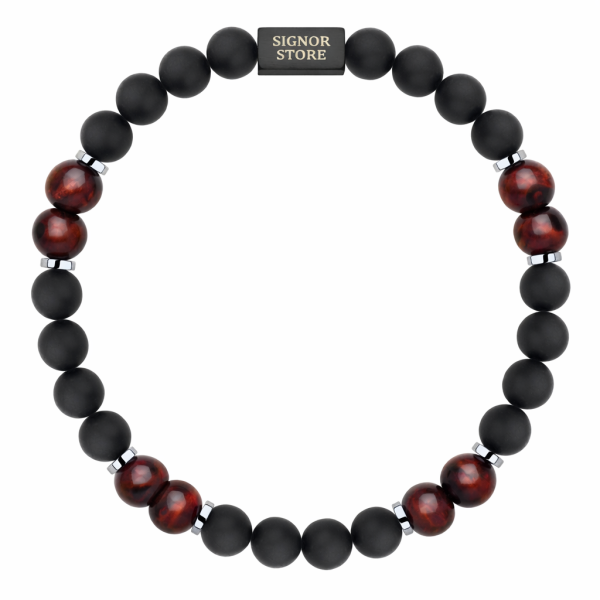 Łączy surową elegancję czarnego, matowego turmalinu z intensywnym, ciepłym połyskiem bawolego oka. Ten duet tworzy kompozycję o mocnym charakterze, przyciągającą uwagę subtelną grą światła i głębią odcieni – od głębokiej czerni po brązowo-bordowe refleksy.