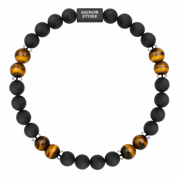 Bransoletka łączy w sobie elegancję czarnego, matowego turmalinu z naturalnym pięknem tygrysiego oka, tworząc harmonijną i stylową kompozycję. Subtelne różnice w odcieniach kamieni oraz ich charakterystyczna, połyskująca struktura nadają biżuterii głębi i indywidualnego charakteru. Przełamaniem matowych powierzchni są lśniące przekładki z hematytu, które wprowadzają nowoczesny akcent i podkreślają symetryczny układ całości. Całość dopełnia stalowa przekładka z wygrawerowanym logo marki, stanowiąca elegancki detal o wysokiej trwałości.