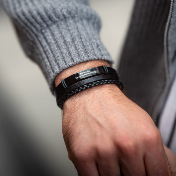 Bransoletka składa się z trzech czarnych pasków skóry: dwóch gładkich oraz jednego plecionego w warkocz, co tworzy spójną kompozycję. W centralnej części znajduje się stalowa, czarna blaszka, na której można umieścić indywidualny grawer – od imienia po ważną datę czy hasło. Aby zachować jej stabilne położenie, blaszka została zabezpieczona silikonowymi stoperami po obu stronach, które zapobiegają przesuwaniu się podczas noszenia.