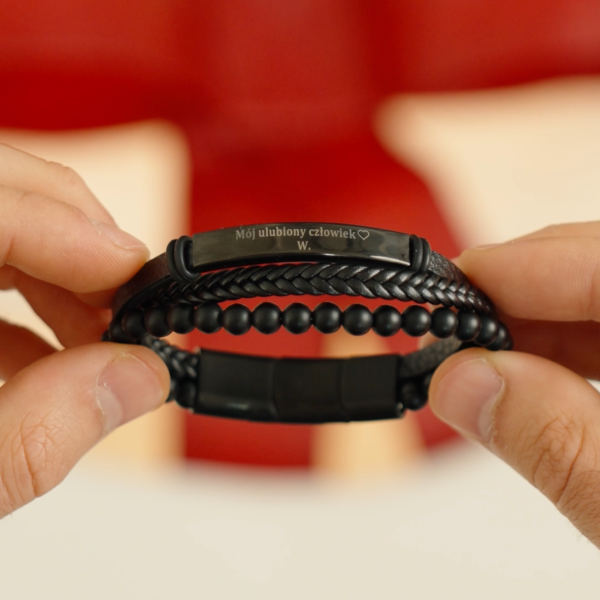 Męska, potrójna bransoletka łączy w sobie trzy różne elementy: dwa skórzane rzemienie oraz odcinek z kamieni nawleczonych na wytrzymałą linkę jubilerską. Wszystkie elementy utrzymane są w głębokiej, klasycznej czerni, którą dopełnia elegancka stal nierdzewna. Centralnym punktem bransoletki jest stalowa blaszka – idealna do personalizacji. Z dwóch stron blaszki umieszczono dyskretne silikonowe stopery, by element nie przemieszczał się w trakcie noszenia.