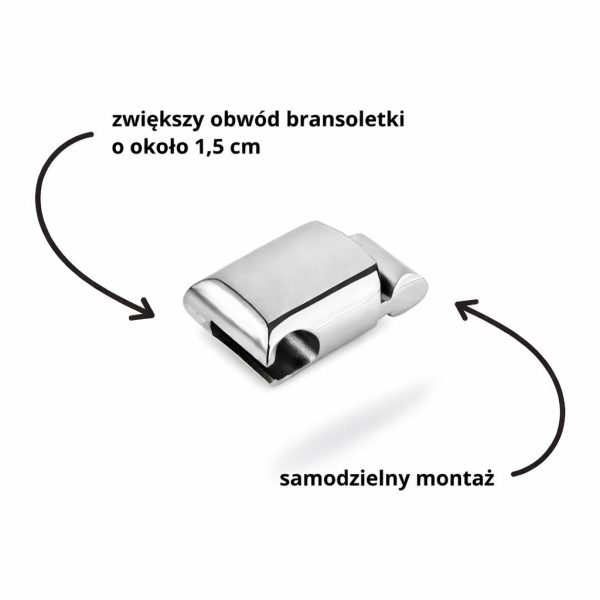 W zestawie znajduje się także przedłużka regulacyjna, która pozwala zwiększyć rozmiar bransoletki o około 1,5 cm – idealne rozwiązanie, jeśli szukasz bardziej uniwersalnego dopasowania lub prezentu dla kogoś, kogo rozmiaru nadgarstka nie znasz dokładnie.
