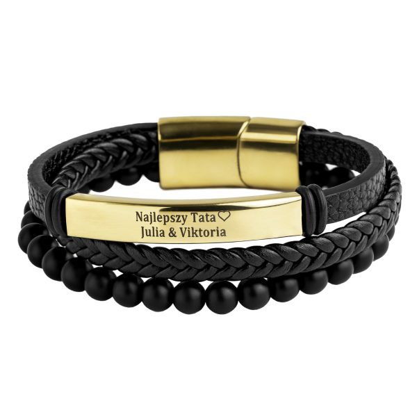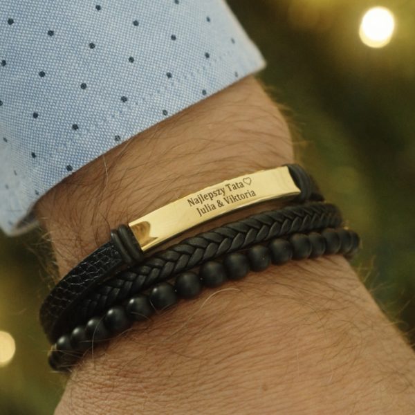 Męska, potrójna bransoletka łączy w sobie trzy różne elementy: dwa skórzane rzemienie oraz odcinek z kamieni nawleczonych na wytrzymałą linkę jubilerską. Wszystkie elementy utrzymane są w głębokiej, klasycznej czerni, którą dopełnia elegancka stal nierdzewna. Centralnym punktem bransoletki jest stalowa blaszka – idealna do personalizacji. Z dwóch stron blaszki umieszczono dyskretne silikonowe stopery, by element nie przemieszczał się w trakcie noszenia.